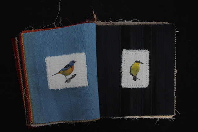 Aves de Casa 2° edición. Libro textil. 23cm x 23cm.Transfer, pintura en lápiz, costura, bordado. 23 hojas. 2022. Registro de aves en el barrio. 43 especies observadas hasta mediados de 2022.